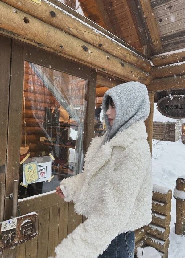 하얀 설경과 어울리는 아이보리빛 뽀글이와 도톰한 후드, 청바지까지 머리부터 발끝까지 여친룩으로 무장하고 즐긴 삿포로 카리나.