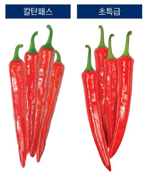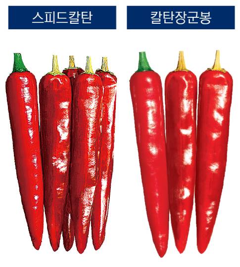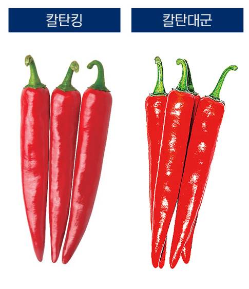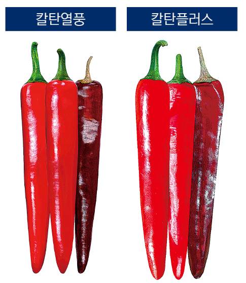 ◆아시아종묘=<칼탄열풍>은 중조생·대과 품종이다. 칼라병·탄저병·역병에 강한 복합내병계 품종이며 재배가 용이하다. 착과력과 수량성도 좋으며 과형이 균일하다. 초형은 반개장형이라 재배가 용이한 편이다. 적당한 매운맛이 난다.