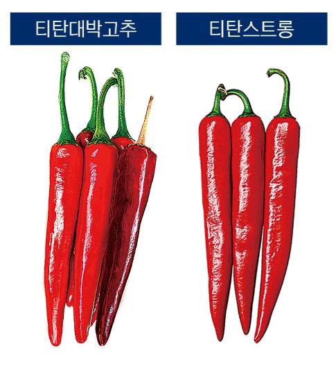<티탄스트롱>은 매운맛이 강하고 착과력이 우수해 생육 후기까지 수확량이 많다. 과형이 크고 매끈해 상품성이 우수하며 과 무게도 무거워 고춧가루 양이 많다. 칼라병을 비롯해 오이모자이크바이러스·담배모자이크바이러스·탄저병 등에 강한 복합내병계 고추 품종으로, 작황 기복 없이 안정적으로 재배할 수 있다.
