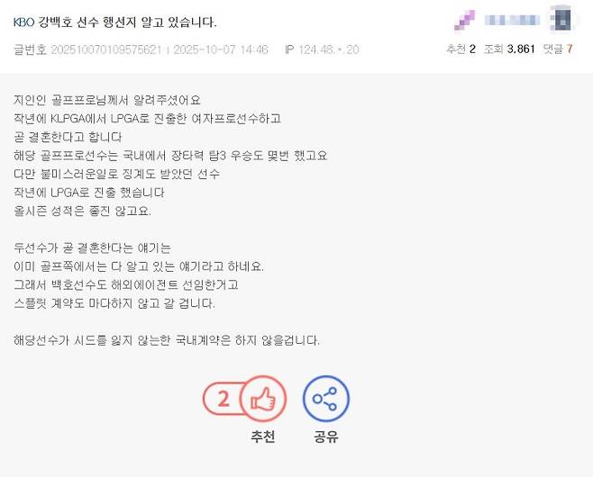 글을 최초로 작성한 온라인 커뮤니티 유저 A 씨는 강백호 선수 행선지를 알고 있다고 주장하며 그가 여자 프로 골프 선수와 곧 결혼한다고 주장했습니다. 글쓴이는 해당 여성 골퍼가 불미스러운 일로 논란이 됐던 인물이며 올시즌 성적이 좋지 않다며 윤이나를 특정하는 듯한 글을 남겼던 것인데요. 그러면서 A 씨는 "이미 골프 쪽에서는 다 알고 있는 이야기라고 한다"라고 주장했습니다.