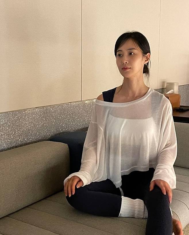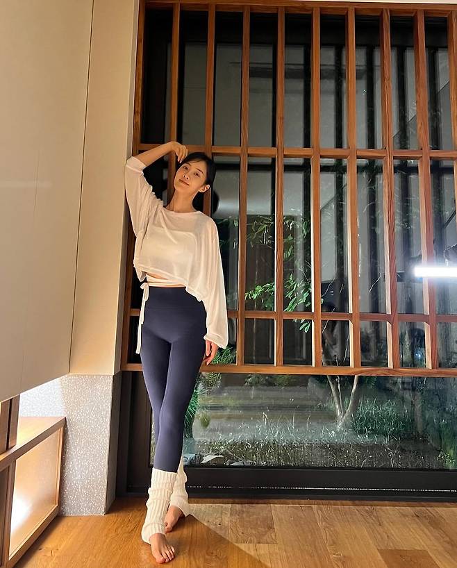 다도리조트에서 촬영한 듯한 내추럴한 공간에서 요가룩을 완벽히 소화하며 건강한 아름다움을 드러냈다.