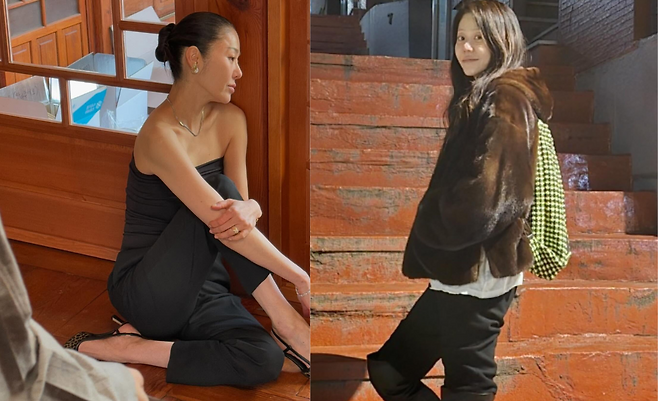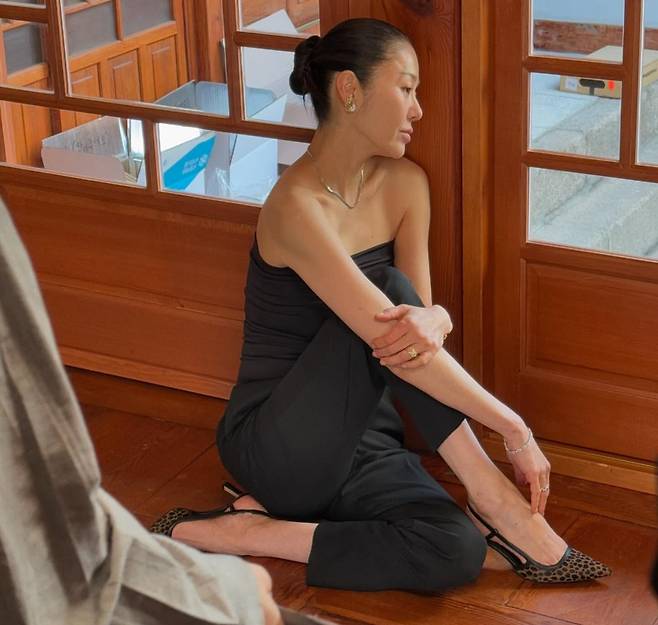 두 번째 사진에서는 고현정이 올블랙 룩으로 고급스러운 매력을 뽐내고 있다. 블랙 튜브탑과 팬츠는 심플하지만 세련된 실루엣을 강조하며, 레오파드 패턴의 힐은 포인트 아이템으로 활용되어 스타일에 생동감을 더한다. 깔끔하게 올린 헤어와 액세서리는 우아함을 배가시키며, 전통적인 공간과 조화를 이루어 독특한 분위기를 자아낸다.