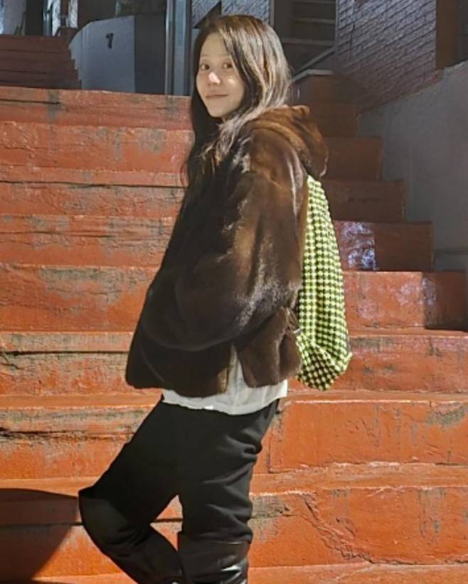 첫 번째 사진에서는 고현정이 브라운 퍼 재킷과 블랙 팬츠를 매치하여 따뜻하고 스타일리시한 겨울 패션을 선보인다. 재킷의 풍성한 텍스처는 고급스러운 느낌을 주며, 체크무늬 가방은 캐주얼한 요소로 스타일을 균형 있게 완성한다. 계단 위에서 찍힌 사진은 자연스러운 동작과 함께 도시적인 감각을 강조한다.