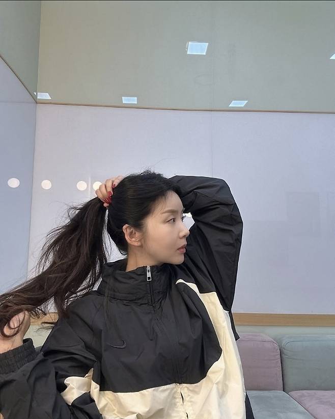 박솔미는 블랙&크림 배색 윈드브레이커에 높은 포니테일을 연출해 활기차고 스포티한 분위기를 강조했습니다.