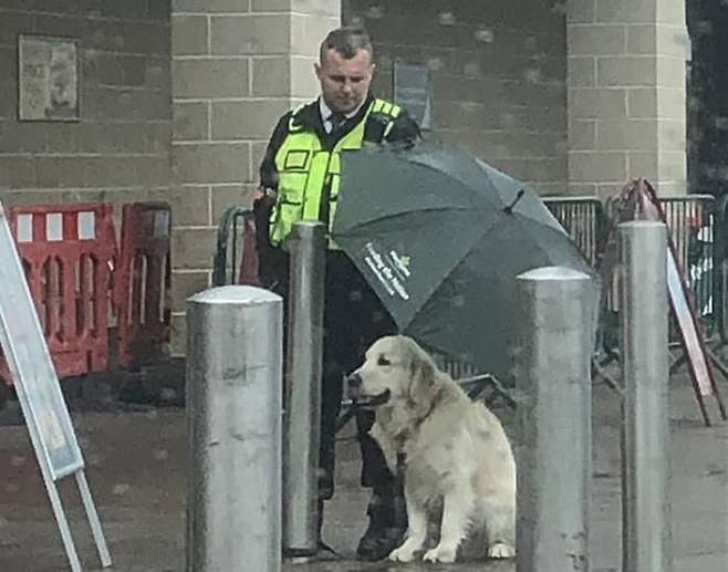 사진 속 보안요원은 아무 말 없이 강아지를 바라보며 서 있었고, 반려견은 비 한 방울 맞지 않은 채 조용히 주인을 기다리고 있었습니다.