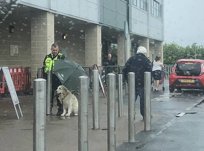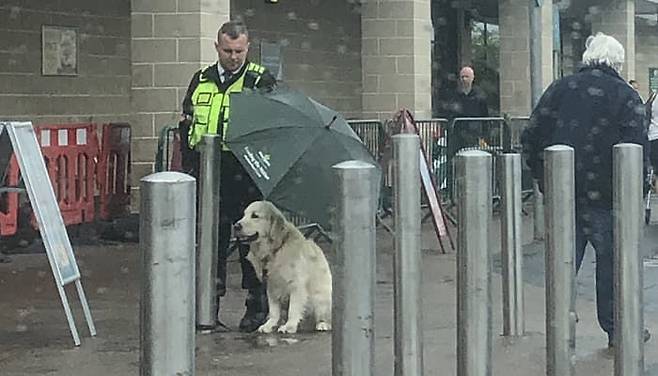 비를 맞으며 주인을 기다리던 한 반려견을 위해, 마트의 보안요원은 망설임 없이 자신의 우산을 씌워주었습니다.