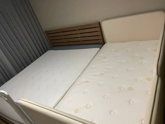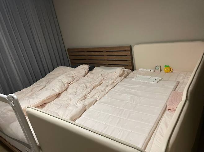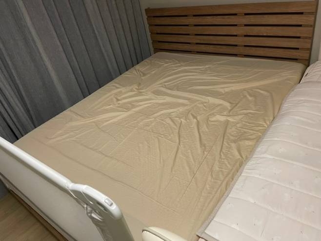 저희는 평소 킹사이즈의 부부 침대와 슈퍼 싱글 사이즈의 아기 침대를 붙여 사용 중입니다. 결혼하며 구입했던 부부 침대는 우리 집에 온 지 벌써 8년이 되었어요.