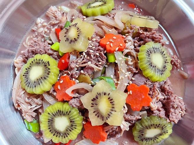 • 키위를 너무 많이 넣으면 고기가 지나치게 연해져서 형태가 무너질 수 있어요