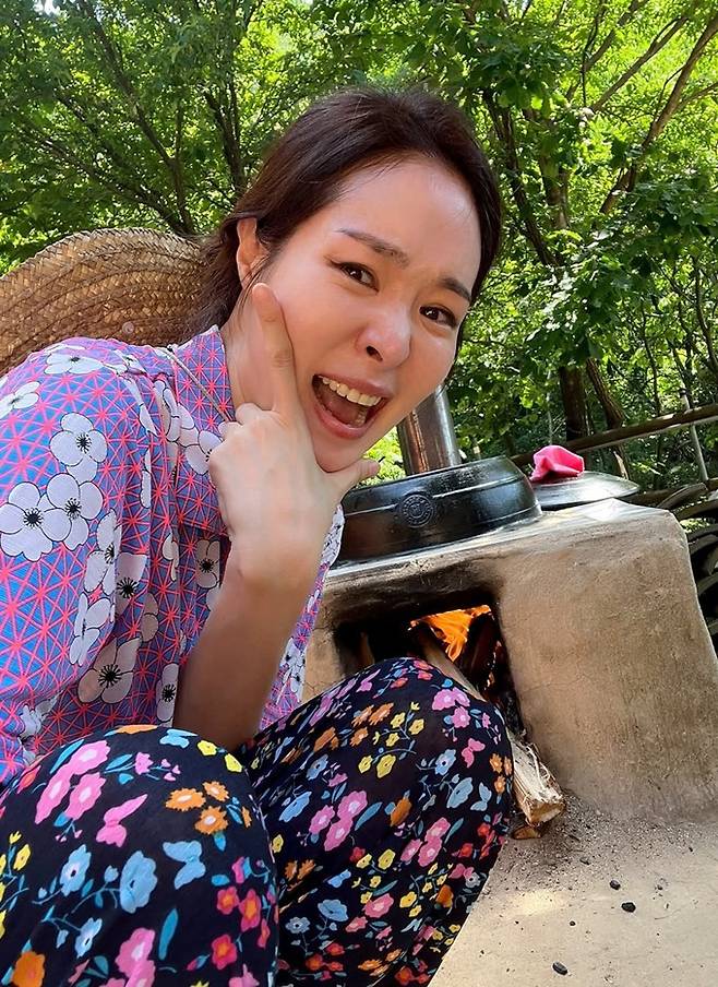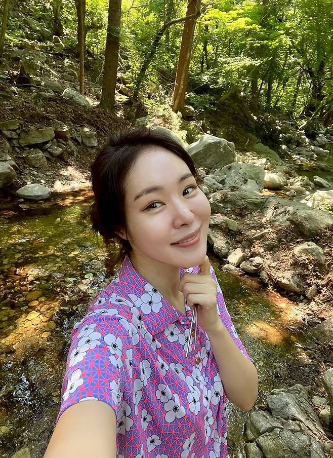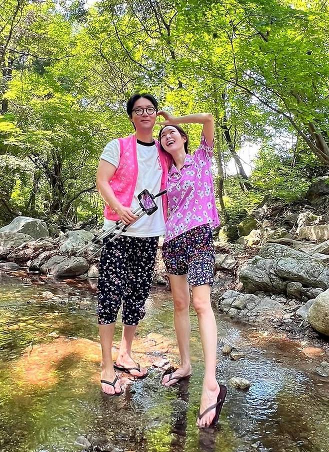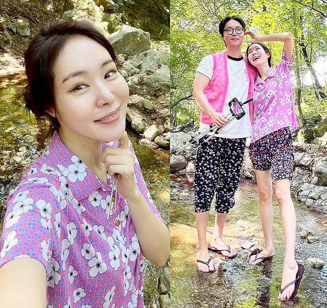 개그우먼 미자가 남편 김태현과 꽃무늬 커플룩으로 계곡 나들이를 제대로 즐겼다.