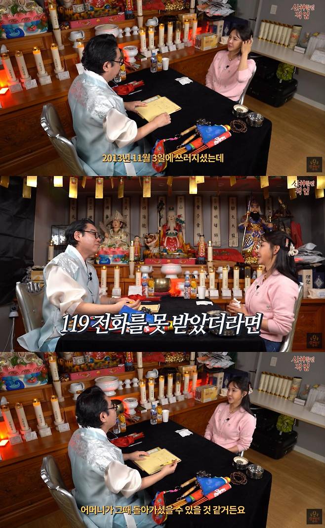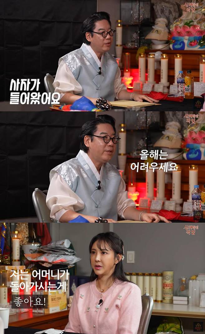 무속인은 점을 보던 중 "안 좋은 사람이 있다는 말이 나온다. 아줌마가 드러누워 있다"며 "명줄 가지고는 말 안하는데, 하지만 이번 년도는 좀 어려우시겠다"고 이야기했다.