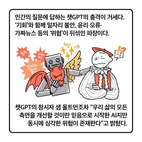 인간의 질문에 답하는 챗GPT의 충격이 거세다. ‘기회’와 함께 일자리 불안, 윤리·오류·가짜뉴스 등의 ‘위협’이 뒤섞인 파장이다. 사상 최초인 미 의회의 AI 청문회에 불려 나온 챗GPT의 창시자 샘 올트먼(오픈AI의 CEO)조차 “우리 삶의 모든 측면을 개선할 것이란 믿음으로 시작한 AI지만 동시에 심각한 위험이 존재한다”고 밝혔다. 빌 게이츠는 “내 인생에서 혁명적이라 생각한 두 가지 기술은 1980년 PC의 윈도 운영 체제 근간인 그래픽 사용자 인터페이스(GUI)의 시연, 그리고 두 번째가 챗GPT”라고 했다. PC 이후 인류의 진화가 AI라는 얘기다. 젠슨 황 엔비디아 CEO도 “스티브 잡스가 아이폰을 선보인 순간과 비슷한 충격”이라며 “이제 컴퓨터에 뭔가 말하기만 하면 모두 프로그래머가 될 수 있는 세상”이라고 규정했다.
