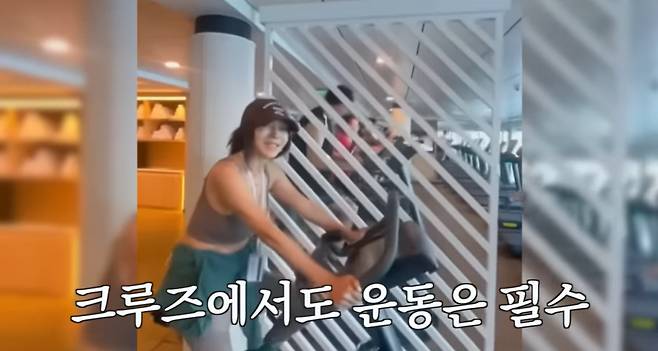 60대 배우 황신혜는 여행 중에도 실내 자전거를 타는 모습을 보여줬다.
