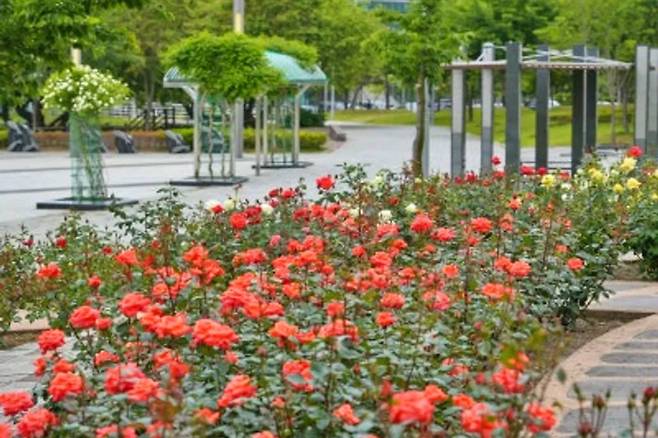 장미가 피는 시기에는 공원 전체가 자연 포토존이 된다. 빨간 벤치, 조형물, 장미 아치 아래에서는 SNS 인증샷을 남기려는 방문객이 끊이지 않는다.