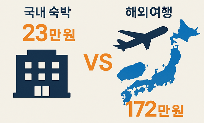 반면 해외 여행은 평균 6.56일, 1인당 172만 5,000원으로 하루 26만 3000원에 달했습니다. 총액 기준으로 무려 7배 이상 차이 납니다.