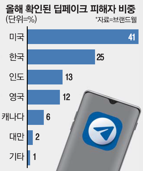 AI 탐지 전문 업체인 브랜드웰의 저스틴 맥길 창업자겸 최고경영자(CEO)는 “딥페이크만 다루는 전문적인 ‘딥누드’와 같은 앱이 등장할 정도로 딥페이크 물이 광범위하게 유통되고 있다”면서 “특히 한국인 비중이 크다는 점에서 놀랍다”고 말했다. 브랜드웰에 따르면, 딥페이크 포르노 사이트에서 등장하는 인물을 국적별로 살펴보면, 미국 41%, 한국 25%, 인도 13%, 영국 12%, 캐나다 6% 순이다.