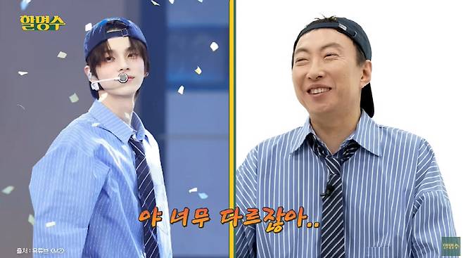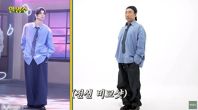 이날 박명수는 그룹 투어스 리더 신유의 복장을 그대로 따라 입었다.