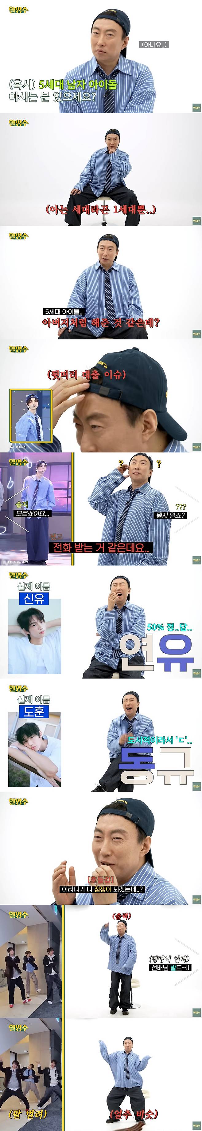 제작진은 "오늘 특별히 코디님께 '5세대 남자 아이돌 처럼 해달라'고 부탁을 했다"고 하자, 박명수는 "5세대 아이돌 아버지처럼 해준 것 같다"며 웃었다. 이날 박명수는 그룹 투어스 리더 신유의 복장을 그대로 따라 입었다. 신유의 모습을 본 박명수는 "너무 다르다. 나는 앞에 머리가 없어서 끌어서 당긴게 여기다"며 뒷머리 대출 이슈 멘트로 폭소를 자아냈다.