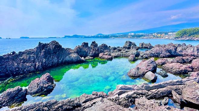 현무암 사이로 잔잔히 고인 바닷물은 믿기지 않을 만큼 맑고 투명하다. 발 아래 돌멩이 하나까지도 선명하게 보이고, 맑은 날엔 멀리 한라산까지 비쳐 그야말로 한 폭의 풍경화를 이룬다. 특히 사진을 좋아하는 여행자라면 “인생샷” 한 장쯤은 무조건 건질 수 있는 포인트다.