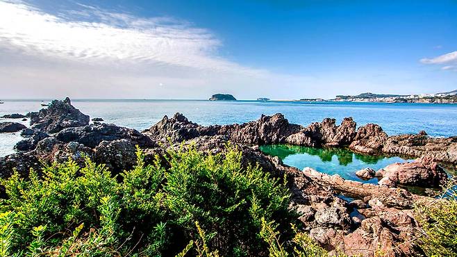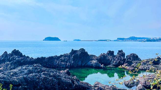 바위 위에 조용히 앉아 있는 것만으로도 어느새 마음이 차분해지고, 투명한 물 속을 들여다보다 보면 시간 감각마저 희미해진다. 하늘빛이 바다에 번지고, 멀리 보이는 한라산 능선이 배경이 되어주는 이 풍경은 어떤 설명보다도 직접 경험할 때 더 깊은 감동을 선사한다.