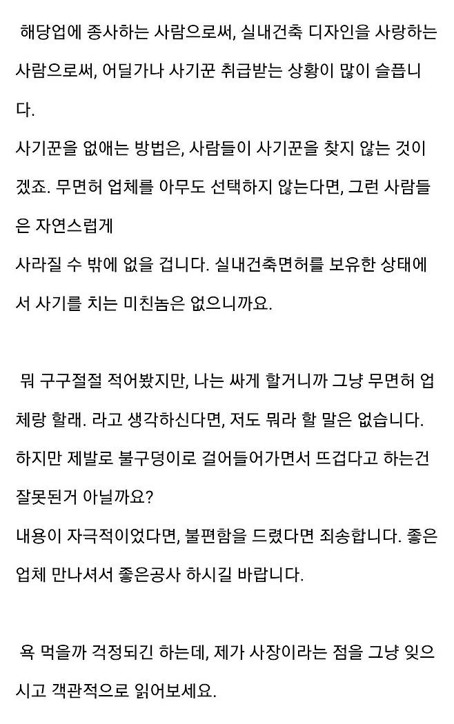 인테리어 공사는 비용도 크고 과정도 복잡하기 때문에 사기를 당하지 않도록 철저하게 준비하는 것이 중요합니다.