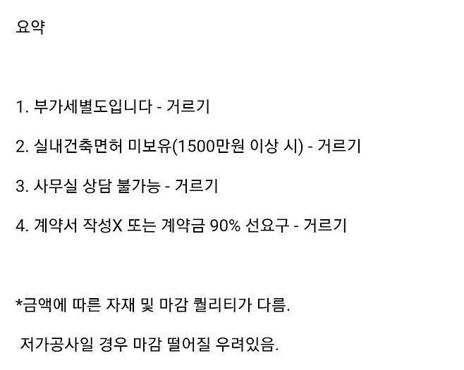 ❌ 계약서 없이 공사를 진행하는 업체❌ 선금 50% 이상 요구하는 업체