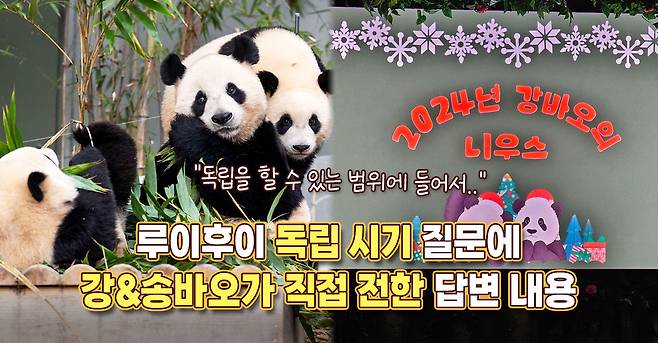 이에 "아이바오랑 가위바위보로 결정하겠다"며 웃음을 안긴 강바오는 "모유는 아이바오가 조절하고 있고 모유를 끊는 건 독립을 의미하는 것"이라고 전했습니다.