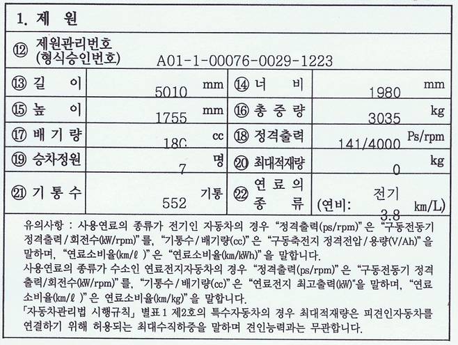 사실 바로 아래 아주 작은 글씨로 유의사항을 적어뒀는데요. 전기차의 경우 정격출력은 구동전동기의 정격출력, 기통수와 배기량은 축전지의 정격전압과 용량이라고 각각 적혀있습니다.