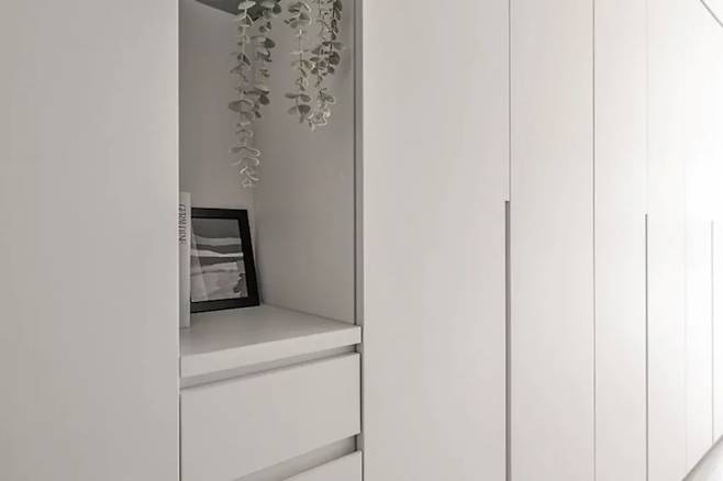 현관문을 열면 가장 먼저 보이는 것은 깔끔한 화이트 색상의 수납장입니다. 일반적으로 수납장은 공간을 차지하기 마련이지만, 이 집에서는 순백색으로 조화롭게 녹아들어 오히려 공간을 밝게 만듭니다.