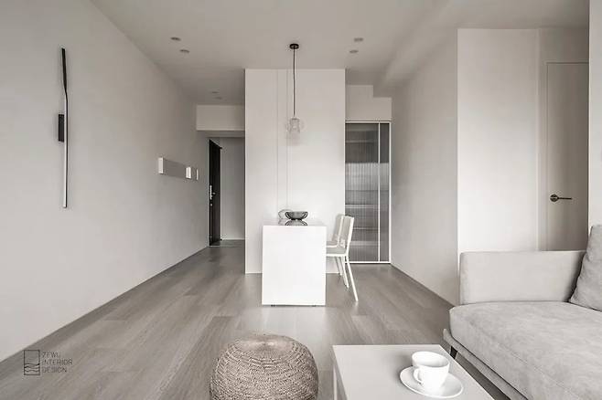 거실로 들어서면 전통적인 구조에서 벗어난 미니멀한 디자인이 돋보입니다. 무광 화이트 페인트로 마감된 벽은 부드럽게 자연광을 반사하며, 따뜻하고 아늑한 분위기를 만들어냅니다.