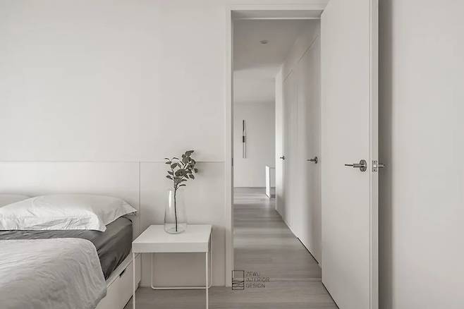 침대 헤드보드에는 세로 홈이 있어 시선을 부드럽게 끌어당깁니다. 문틀을 따라 이어지는 구조적 프레임은 공간의 흐름을 제공하며, 은은한 간접 조명은 밤에도 눈부심 없이 아늑한 분위기를 만들어냅니다.