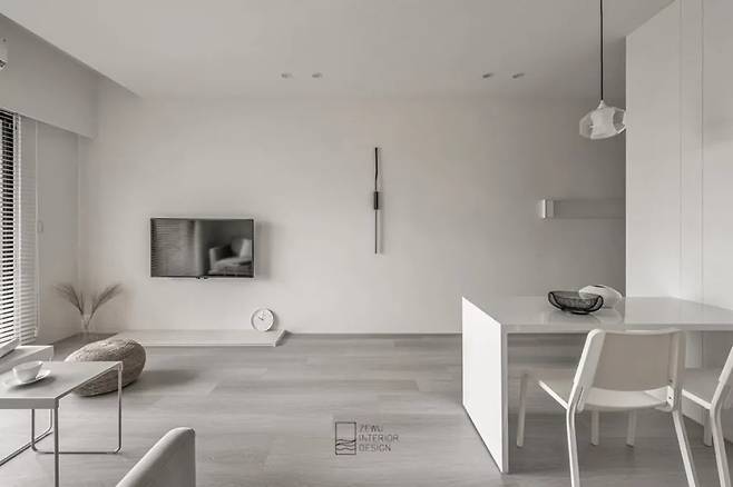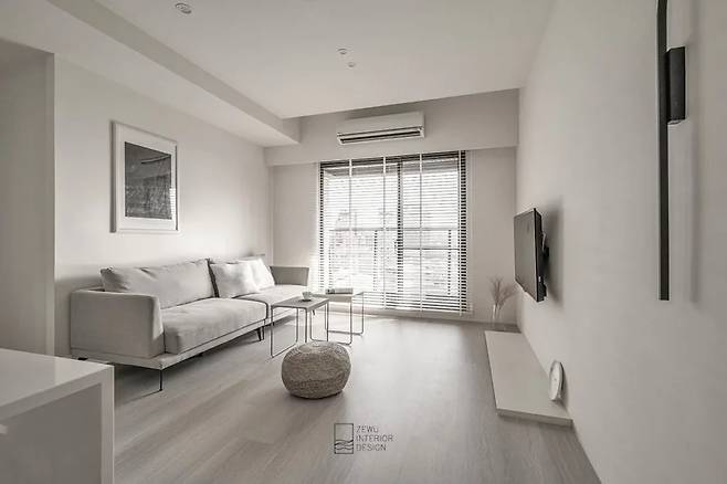 화이트 우드로 만들어진 블라인드는 빛 조절이 용이하고, 은은한 그림자를 연출하여 정돈된 느낌을 줍니다. 텔레비전 아래 설치된 낮은 패널은 시선을 아래로 유도하며, 벽등은 부드러운 곡선으로 입체적인 시각 효과를 제공합니다.