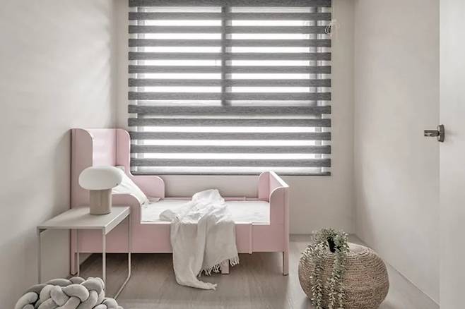 아이 방도 집 전체의 스타일과 일관성을 유지합니다. 화이트 배경에 강렬한 핑크색 침대가 눈에 띄며, 질감 있는 암막 커튼은 아이들이 편안하게 수면하고 놀 수 있는 환경을 조성합니다.