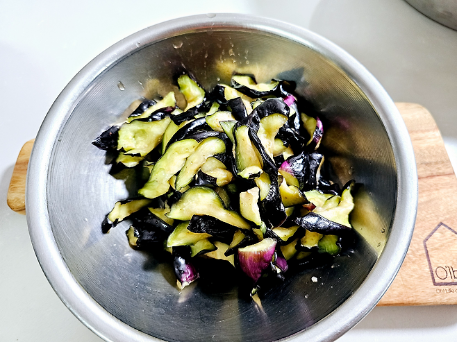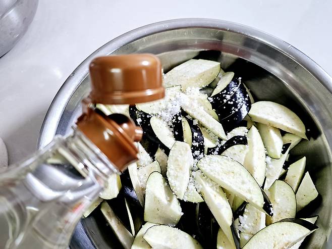 가지를 반으로 갈라 어슷썰기 한 뒤소금과 올리고당을 넣고 버무려 10~20분 절이기→ 이렇게 하면 쫄깃한 식감 확보!