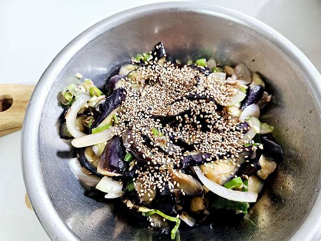 절여진 가지는 꽉 짜서 물기를 제거→ 물컹 방지의 핵심입니다!