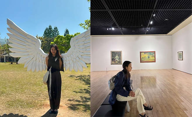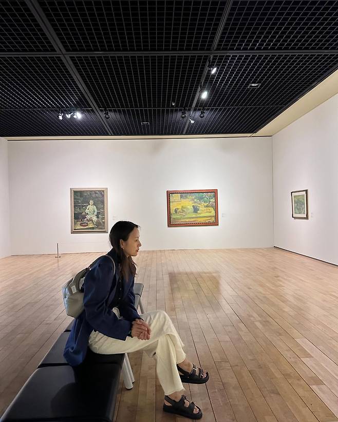 네이비 재킷과 아이보리 팬츠로 차분한 분위기를 연출한 이효리는, 블랙 샌들과 그레이 백팩으로 실용성과 스타일을 동시에 잡았다. 미술관의 정적인 분위기와 어울리는 절제된 컬러 매치가 인상적이다.
