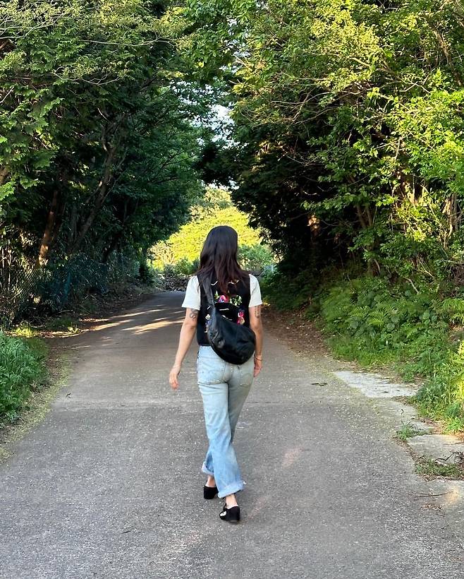 화이트 프린트 티셔츠와 연청 와이드 데님 팬츠로 자연스러운 무드를 완성했다. 블랙 슬링백과 작은 백팩으로 활동성을 강조했으며, 소매에 드러난 타투가 이효리 특유의 자유로운 이미지를 더한다.