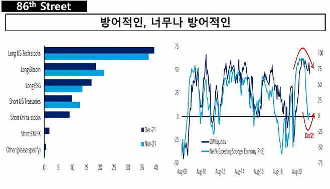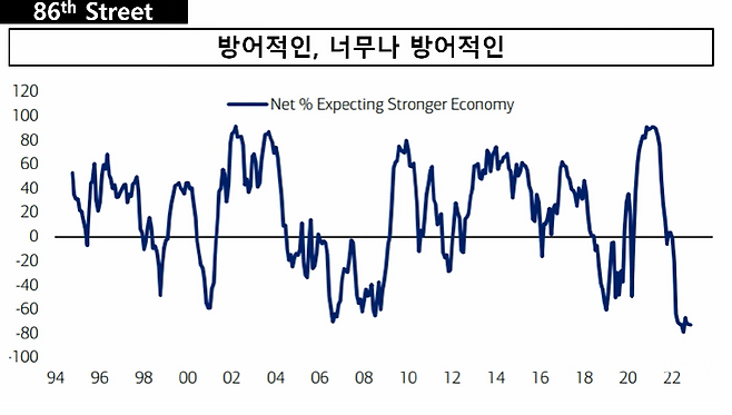 저는 주식을 할 때 가격이나 심리가 중요하다고 생각합니다. 뱅크오브아메리카에서 매달 글로벌 펀드매니저들 대상으로 조사를 하는데요. 가장 최근에 나온 지표를 보면 너무 방어적인 모습입니다. 향후 경제가 강해질 것으로 보는 사람은 아무도 없고, 지표도 금융위기 때보다 나쁘게 나타나고 있습니다.