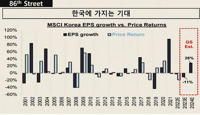 짙은 색이 이익 증가율, 옅은 색이 주가 상승률입니다. 2021년도를 보면 이익은 크게 증가했지만 주가는 빠졌고, 22년도에는 이익은 약간 감소했는데 주가는 추가적으로 더 빠졌습니다. 골드만삭스에서도 한국은 내년 -11% 감익하지만, 내후년에는 28% 오를 것을 전망하고 있습니다. 그렇기 때문에 저는 지금 미리 사야한다고 생각합니다.