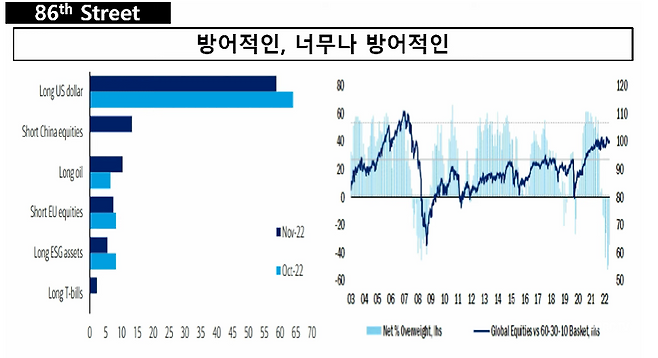 2022년 11월에 나온 가장 최근 자료입니다. 현재는 방어적인 모습으로, 왼쪽을 보면 지금 가장 많은 포지션이 미국 달러입니다. 우측을 보면 심리도 마이너스로 내려간 것을 볼 수 있습니다.