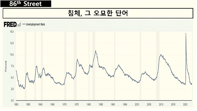 100% 설명력을 가진 데이터가 실업률입니다. 침체 구간에서 실업률은 반드시 많이 올라갔습니다. 그렇기 때문에 지금 봐야할 것은 고용이고요. 현재 상황으로는 얕은 경기침체를 예상하는 목소리도 있기 때문에 주가를 너무 부정적으로 볼 필요는 없다고 생각합니다.