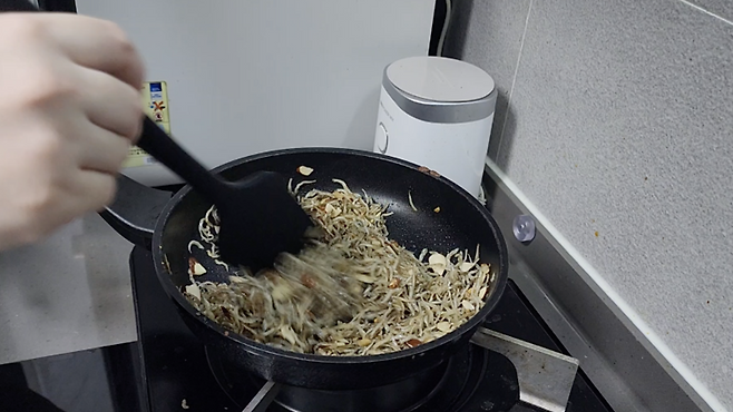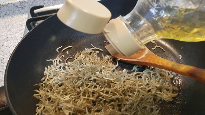 멸치 100g을 마른 팬에 약불로 볶아 비린내를 제거한 뒤, 올리브오일 3큰술과 다진 마늘 1큰술을 넣어 향을 냅니다.