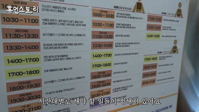 점검 일정표 같은 것도 있고요. 사람을 어떻게 써야 하는지에 대한 자료도 있습니다. 아까 재료비에 관한 것이었다면 이건 인건비에 관한 거예요. A는 정규직 한 명으로, 시간대별로 해야 할 일들이 정해져 있고, B도 마찬가지인데 일이 중첩되지 않도록 짜여 있습니다. 같은 일을 또 하면 안 되니까요. 이게 바로 매뉴얼입니다.