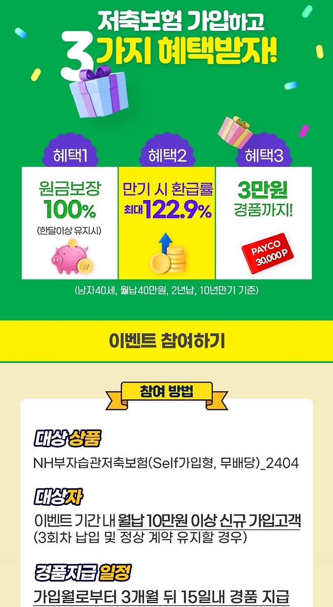 페이코 전체메뉴에서 금융상품몰에 농협저축보험 월 10만이상 가입하면 3달 후에 3만 페이코포인트 지급해주는 이벤트가 있네요 한달이상 유지하면 원금 100%유지 문구도 있어서 가입했네요
