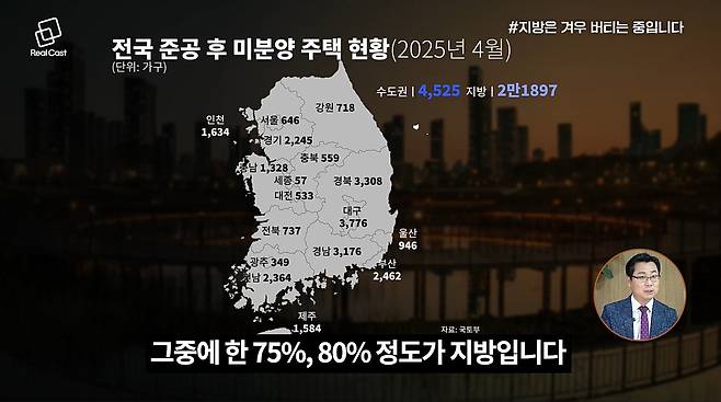 지금도 전국적으로 약 7만 호의 미분양이 유지되고 있으며, 이 중 75~80%가 지방에 집중되어 있습니다. 특히 준공 후 미분양은 지속적으로 증가 중입니다. 이는 지방의 주택 시장이 구조적으로 회복되기 어려운 상황임을 보여주는 지표입니다.