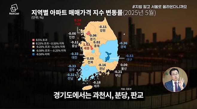 지방의 자산가들조차 미래 가치를 우려하며 서울로 이동하고 있으며, 과천 등 대체 지역에 대한 수요도 늘고 있습니다. 마포, 성동 등을 포함해 일부 서울 및 수도권 지역만이 상승세를 유지하는 가운데, 전체 통계를 보면 전국 평균은 하락세이며 서울만 유일하게 상승 중입니다. 특히 일부 지역은 주간 매매가격 변동률이 0.3% 이상으로, 통계상 '폭등'에 해당합니다.