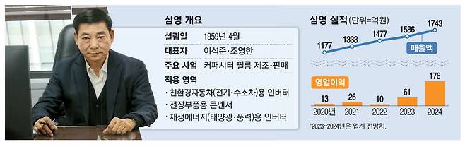 삼영은 전기전자 핵심 소재인 커패시터 필름을 국내에서 유일하게 생산하고 있다. 커패시터는 '전기를 담는 그릇'으로 저장해둔 전기를 필요한 때 방출해 전자제품의 원활한 작동을 돕는다. 일반 가전제품을 비롯해 풍력·태양광 등 재생에너지에도 광범위하게 사용된다. 이 커패시터를 감싸는 필름은 일본 도레이첨단소재와 오지제지가 전 세계 시장을 독과점하고 있다. 삼영은 세계 시장 점유율 10%로 3위를 차지하고 있다.