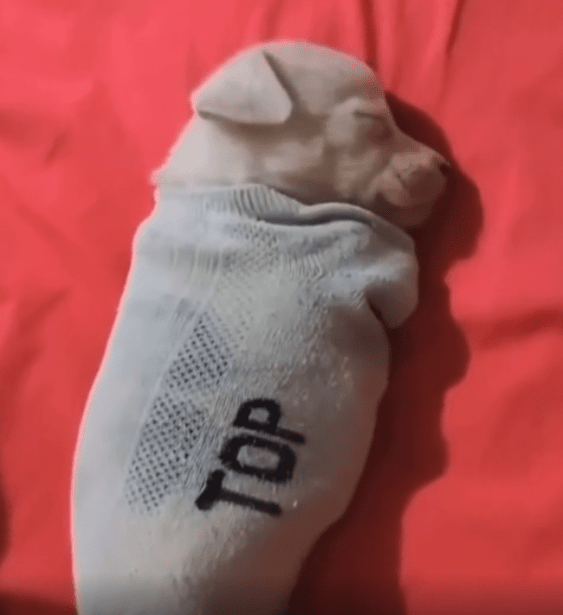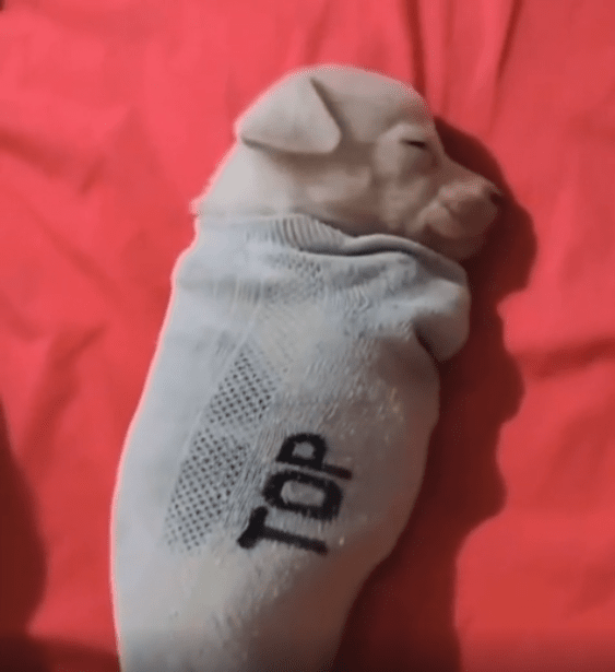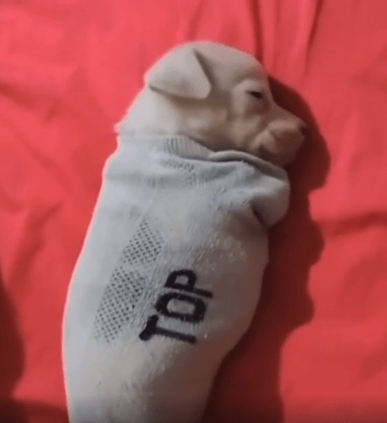 갓 태어난 듯 아직 몸집이 손바닥만 한 이 강아지는 양말 안에 폭 파묻힌 채 스르르 잠이 들어 있습니다. 머리는 입구 쪽으로 살짝 삐죽 나와 있고, 양말 속 깊은 곳에는 몸이 아늑하게 감싸여 있죠. 눈은 꼭 감겨 있고, 귀도 말랑하게 접힌 채. 숨을 쉴 때마다 작고 둥근 몸이 천천히 오르내리는 게 전부입니다.