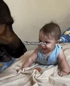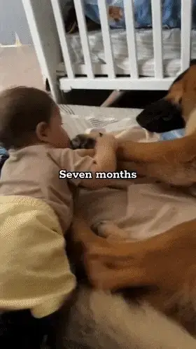 9개월 차, 아기의 포옹에 셰퍼드는 감격합니다. "드디어 우리 아기가 컸구나!"