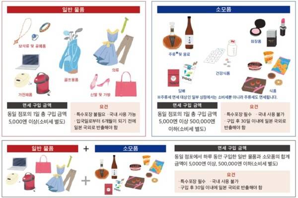 기본적으로 가전제품이나 의류, 가방, 시계와 같은 ‘일반 물품’의 경우 한 매장에서 같은 날에 구입한 물품의 총 금액이 5,000엔(세금 불포함, 이하 모두 세금 불포함) 이상인 경우에 면세 대상이 됩니다. 식품이나 화장품, 의약품 등 ‘소모품’은 같은 매장에서 1일 구입한 총 금액이 5,000엔 이상 50만 엔 이하이고, 일본 국내에서 소비되지 않도록 지정된 방법으로 포장해야 한다는 조건이 있습니다.