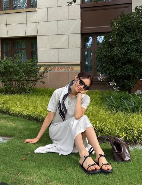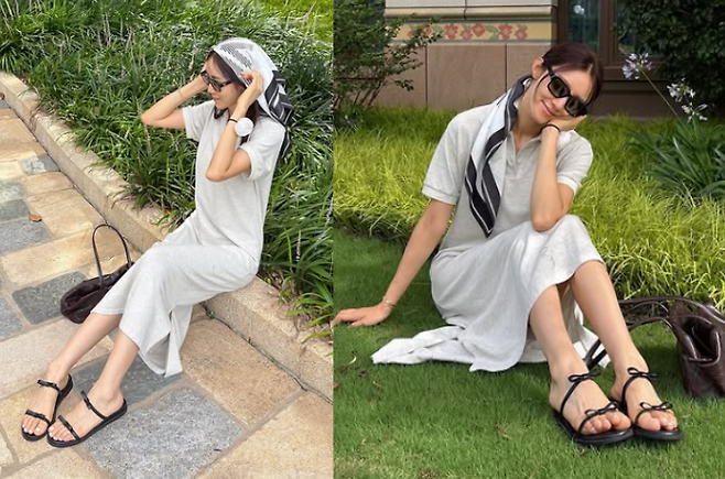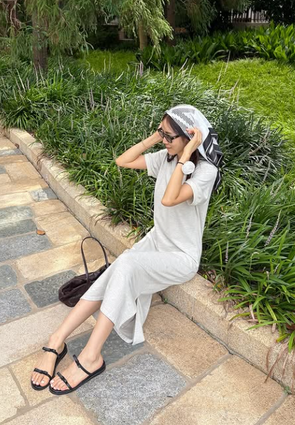 서하얀은 최근 반팔 그레이 원피스를 착용하고 스타일리시한 스카프룩을 완성했습니다.는 스트랩 샌들을 매치해 여름 분위기에 맞는 시원한 룩을 선보였으며, 머리에는 스카프를 두르고 선글라스를 착용하여 완벽한 여름 패션을 완성했습니다.